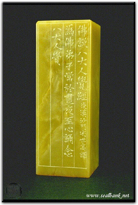 黃嘗銘.四十一歲/刻〔佛說八大人覺經〕正方朱文印。邊款為【佛說八大人覺經。後漢沙門安世高譯。為佛弟子常於晝夜,至心誦念八大人覺。】巴林石。