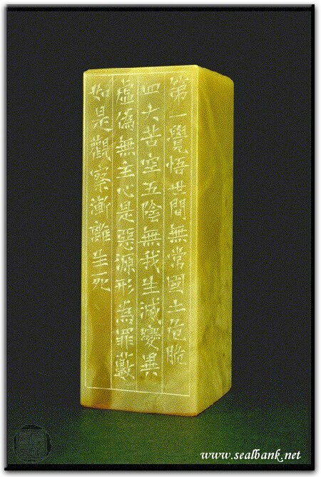 黃嘗銘.四十一歲/刻〔無常無我〕正方白文印。邊款為【第一覺,悟世間無常,國土危脆,四大苦空,五陰無我,生滅變異,虛偽無主,心是惡源,形為罪藪,如是觀察,漸離生死。】巴林石。