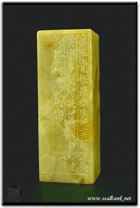 黃嘗銘.四十一歲/刻〔多聞智慧〕正方粗朱文印。邊款為【第五覺,悟愚癡生死,菩薩常念,廣學多聞,增長智慧,成就辯才,教化一切,悉以大樂。】巴林石。