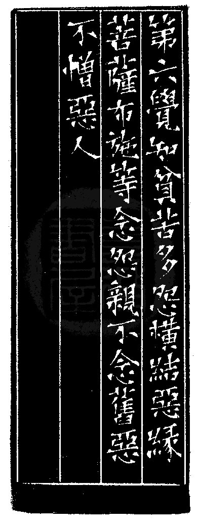 黃嘗銘.四十一歲/刻〔布施平等〕正方朱文印。邊款為【第六覺,知貧苦多怨,橫結惡緣,菩薩布施,等念怨親,不念舊惡,不憎惡人。】巴林石。
