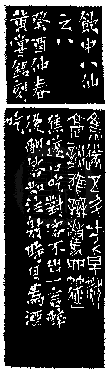 黃嘗銘.四十歲/刻〔五斗高談辯四筵〕正方加框白文印。邊款為【焦遂五斗方卓然,高談雄辯驚四筵。焦遂口吃,對客不出一言,醉後酬答如注射,時目為酒吃。飲中八仙之八,癸酉仲春,黃嘗銘刻。】原印今藏於陳川林。巴林凍。