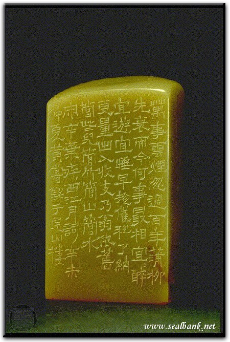黃嘗銘.卅八歲/刻〔而今何事最相宜宜醉宜游宜睡〕長方加框白文印。邊款為【萬事雲煙忽過,百年蒲柳先衰。而今何事最相宜?宜醉宜遊宜睡。早趁催科了納,更量出入收支。乃翁依舊管些兒:管竹管山管水。宋辛棄疾西江月詞。辛未仲夏,黃嘗銘于見山樓。】壽山月尾。