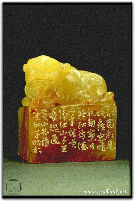 黃嘗銘.卅七歲/刻〔江山千里夢魂通〕長方滿白文印。邊款為【故園相見略雍容,睡起南窗日射紅,詩酒一年談笑隔,江山千里夢魂通。黃山谷詩。庚午,子昭刻。】壽山高山。