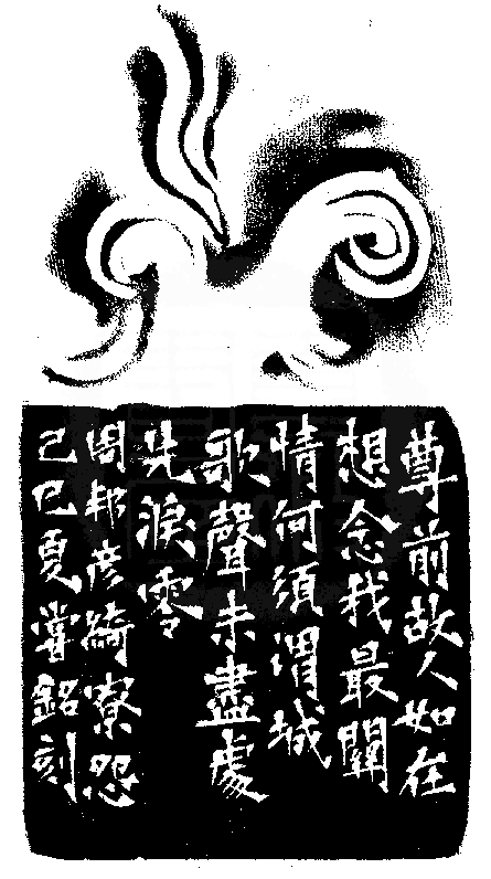 黃嘗銘.卅六歲/刻〔尊前故人如在〕長方朱文印。邊款為【尊前故人如在,想念我、最關情。何須渭城,歌聲未盡處,先淚零。周邦晏綺寮怨。己巳夏,嘗銘刻。】壽山高山。