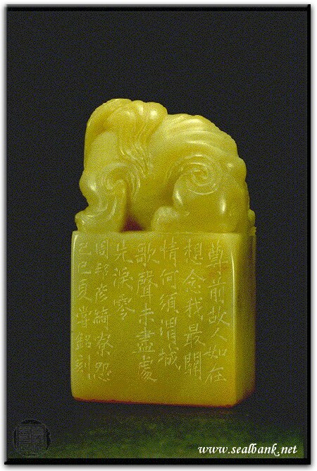黃嘗銘.卅六歲/刻〔尊前故人如在〕長方朱文印。邊款為【尊前故人如在,想念我、最關情。何須渭城,歌聲未盡處,先淚零。周邦晏綺寮怨。己巳夏,嘗銘刻。】壽山高山。