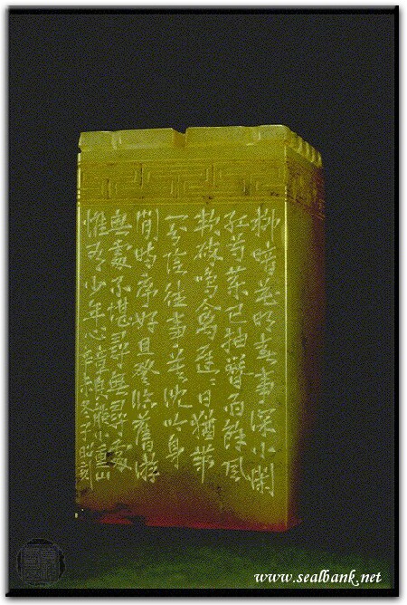黃嘗銘.卅八歲/刻〔舊游無處不堪尋無尋處唯有少年心〕正方朱文印。邊款為【柳暗花明春事深,小闌紅芍藥,已抽簪。雨餘風軟碎鳴禽,遲遲日,猶帶一分陰。往事莫沈吟,身閒時序好、且登臨。舊游無處不堪尋,無尋處,惟有少年心。章良能小重山。辛未冬,子昭刻。】壽山荔枝凍。