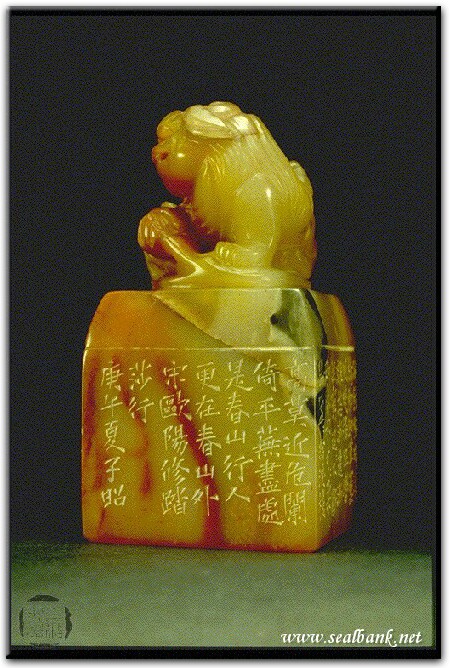 黃嘗銘.卅七歲/刻〔平蕪盡處是春山行人更在春山外〕正方細朱文印。邊款為【候館梅殘,溪橋柳細,草薰風暖搖征轡。離愁漸遠漸無窮,迢迢不斷如春水,寸寸柔腸,盈盈粉淚,樓高莫近危闌倚,平蕪盡處是春山,行人更在春山外。宋歐陽修踏莎行。庚午夏,子昭。】壽山石。