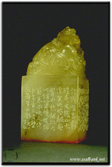 黃嘗銘.卅七歲/刻〔閒愁萬斛酒不敵〕長方白文印。邊款為【傾家釀酒三千石,閑愁萬斛酒不敵。今朝醉眼爛巖電,提筆四顧天地窄。忽然揮掃不自知,風雲入懷天借力。神龍戰野昏霧腥,奇鬼摧山太陰黑。此時驅盡胸中愁,槌床大叫狂墮幘。吳牋蜀素不快人,付與高堂三丈壁!放翁草書歌。庚午,子昭。】壽山荔枝凍。