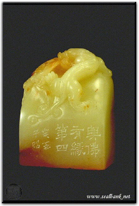 黃嘗銘.四十歲/刻〔與佛有緣〕長方白文印。邊款為【與佛有緣第四。癸酉,子昭。】芙蓉石。