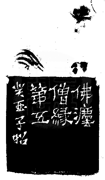 黃嘗銘.四十歲/刻〔佛法僧緣〕正方朱文印。邊款為【佛法僧緣第五。癸酉,子昭。】芙蓉石。