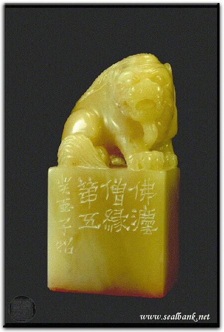 黃嘗銘.四十歲/刻〔佛法僧緣〕正方朱文印。邊款為【佛法僧緣第五。癸酉,子昭。】芙蓉石。