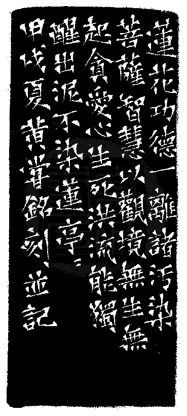 黃嘗銘.四十一歲/刻〔離諸污染〕正方朱文借邊印。邊款為【蓮花功德一,離諸污染。菩薩智慧以觀境,無生無起貪愛心,生死洪流能獨醒,出泥不染蓮亭亭。甲戌夏,黃嘗銘刻並記。】蕭山石。