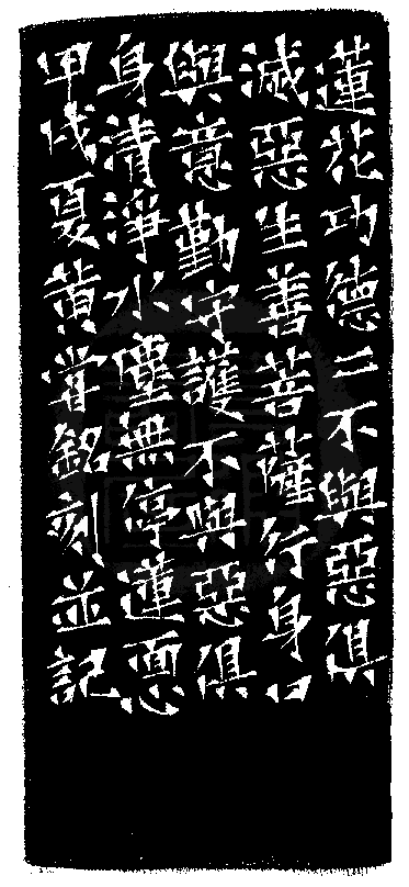 黃嘗銘.四十一歲/刻〔不與惡俱〕正方加框白文印。邊款為【蓮花功德二,不與惡俱。滅惡生善菩薩行,身口與意勤守謢,不與惡俱身清淨,水塵無停蓮面心。甲戌夏,黃嘗銘刻並記。】蕭山石。