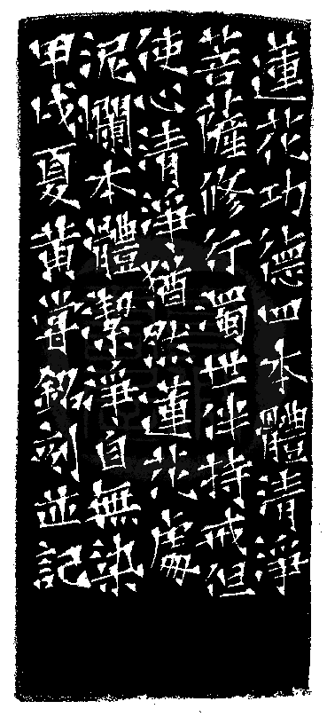 黃嘗銘.四十一歲/刻〔本體清淨〕正方白文印。邊款為【蓮花功德四,本體清淨。菩薩修行濁世伴,持戒但使心清淨,猶然蓮花處泥爛,本體潔淨自無染。甲戌夏,黃嘗銘刻並記。】蕭山石。