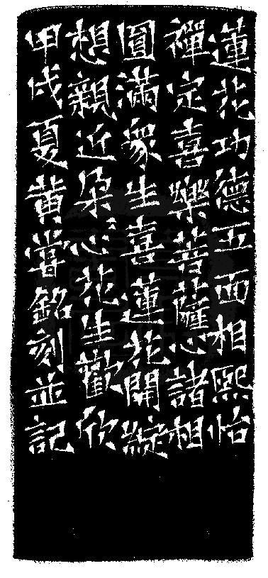 黃嘗銘.四十一歲/刻〔面相熙怡〕正方朱文印。邊款為【蓮花功德五,面相熙怡。禪定喜樂菩薩心,諸相圓滿眾生喜,蓮花開綻想親近,朵朵心花生歡喜。甲戌夏,黃嘗銘刻並記。】蕭山石。