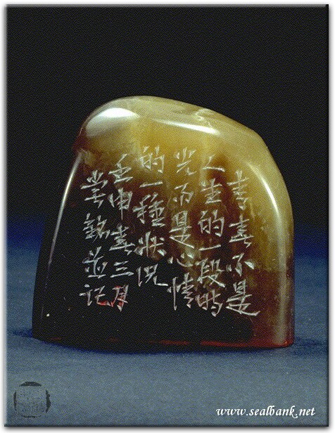 黃嘗銘.卅九歲/刻〔一事能狂便少年〕自然形朱文印。邊款為【青春不是人生的一段時光,而是心情的一種狀況。壬申春三月,嘗銘刻記。】原印今藏於黃麗姿。巴林凍。