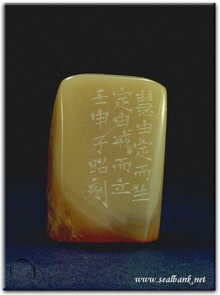 黃嘗銘.卅九歲/刻〔戒定慧〕自然形朱文印。邊款為【慧由定而生,定由戒而立。壬申,子昭刻。】原印今藏於張盞隆。巴林凍。