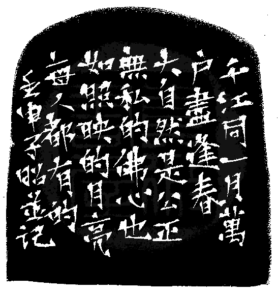 黃嘗銘.卅九歲/刻〔千江有水千江月〕自然形朱文印。邊款為【千江同一月,萬戶盡逢春。大自然是公正無私的,佛心也如照映的月亮,每人都有的。壬申,子昭並記。】原印今藏於李玉堂。巴林凍。