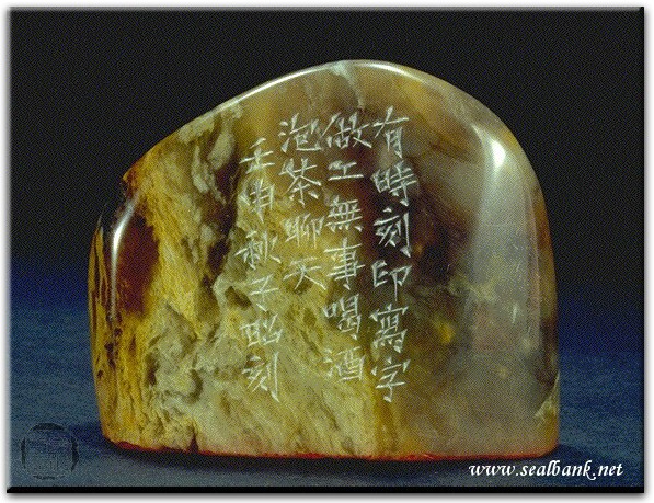黃嘗銘.卅九歲/刻〔有時無事〕自然形朱文印。邊款為【有時刻印寫字做工,無事喝酒泡茶聊天。壬申秋,子昭刻。】原印今藏於陳有樂。巴林凍。