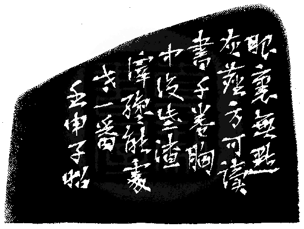 黃嘗銘.卅九歲/刻〔攬得煙雲閒入夢〕自然形朱文印。邊款為【眼裡無點灰塵,方可讀書千卷;胸中沒些渣滓,纔能處世一番。壬申,子昭。】巴林凍。