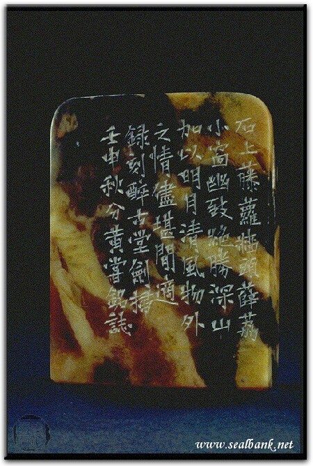 黃嘗銘.卅九歲/刻〔儘堪閒適〕長方朱文印。邊款為【石上藤羅,牆頭薛荔,小窗幽致,絕勝深山,加以明月清風,物外之情,儘堪閒適。錄刻醉古堂劍掃。壬申秋分,黃嘗銘誌。】原印今藏於陳鴻醴。泰來玳瑁石。
