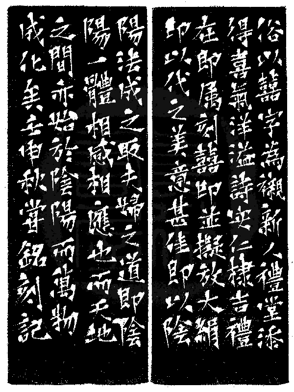 黃嘗銘.卅九歲/刻〔囍〕正方朱白文印。邊款為【俗以囍字為襯新人禮堂,添得喜氣洋溢,詩安仁棣吉禮在即,屬刻囍印,並擬放大絹印以代之,美意甚佳,即以陰陽法成之,取夫婦之道即陰陽一體,相成相應也,而天地之間亦始有陰陽而萬物成化矣。壬申秋,嘗銘刻記。】原印今藏於柯詩安。巴林雞血。