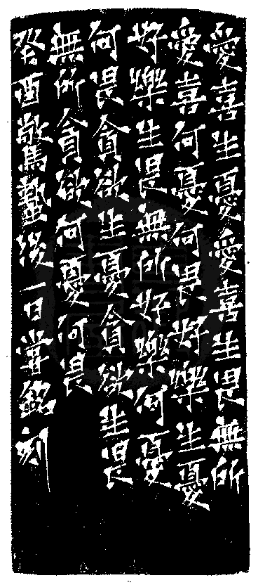 黃嘗銘.四十歲/刻〔何憂何畏〕正方白文縱格印。邊款為【愛喜生憂,愛喜生畏,無所愛喜,何憂何畏。好樂生憂,好樂生畏,無所好樂,何憂何畏。貪欲生憂,貪欲生畏,無所貪欲,何憂何畏。癸酉驚蟄後一日,嘗銘刻。】原印今藏於蕭世瓊。巴林石。