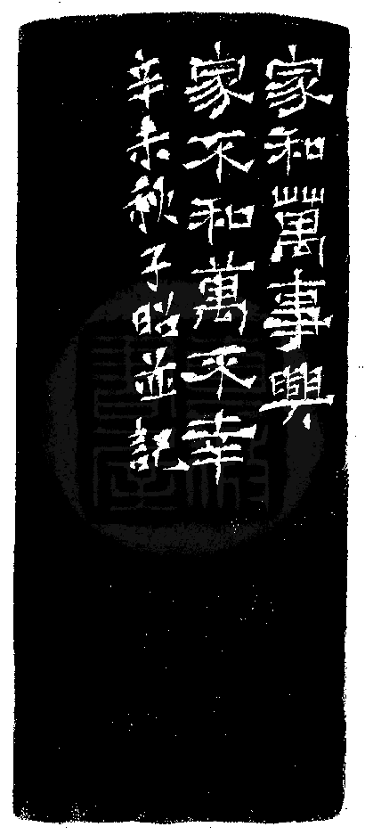 黃嘗銘.卅八歲/刻〔家和萬事興〕正方朱文印。邊款為【家和萬事興,家不和萬不幸。辛未秋,子昭並記。】巴林石。