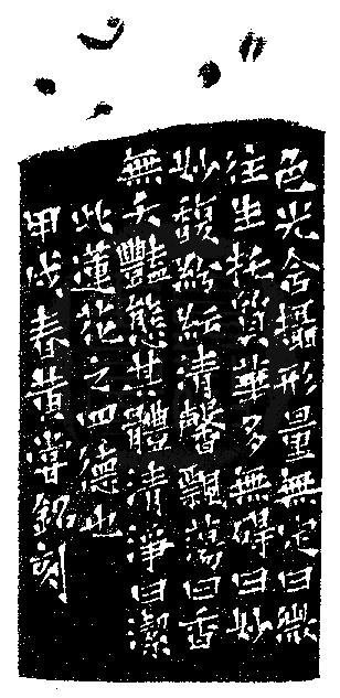 黃嘗銘.四十一歲/刻〔微妙香潔〕正方朱白文印。邊款為【色光含攝形量無定曰微,往生托質華多無礙曰妙,妙馥紛紜清馨飄蕩曰香,無夭豔態其體清淨曰潔,此蓮花之四德也。甲戌春,黃嘗銘刻。】原印今藏於張國萍。壽山硃砂凍。