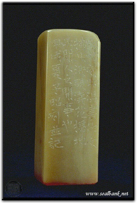 黃嘗銘.四十一歲/刻〔作箇閒人〕正方白文印。邊款為【臨帖、刻印、溫書、作文、拂几、洗硯、澆花、掃地,此閒人之閒事也。甲戌夏,子昭刻並記。】巴林石。
