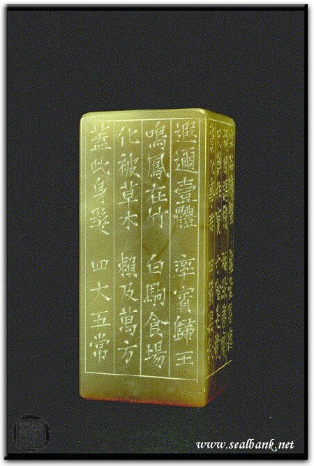 | | 印文:千金敝帚 | | 約 橫 2.9 X 豎 2.9 公分 印面圖 邊款圖 | | 黃嘗銘.四十二歲/刻〔千金敝帚〕正方加框白文印。邊款為【遐邇壹體,率賓歸王,鳴鳳在竹,白駒食場,化被草木,賴及萬方,蓋此身髮,四大五常,恭惟鞠養,豈敢毀傷,女慕貞烈,男效才良,知過必改,得能莫忘,罔談彼短,靡恃己長,信使可復,器欲難量,墨悲絲染,詩讚羔羊,景行維賢,克念作聖,德建名立,形端表正,空谷傳聲,虛堂習聽,禍因惡積,福緣善慶,尺璧非寶,寸陰是競,資父事君,曰嚴與敬】巴林凍。 1995 年刻 |
