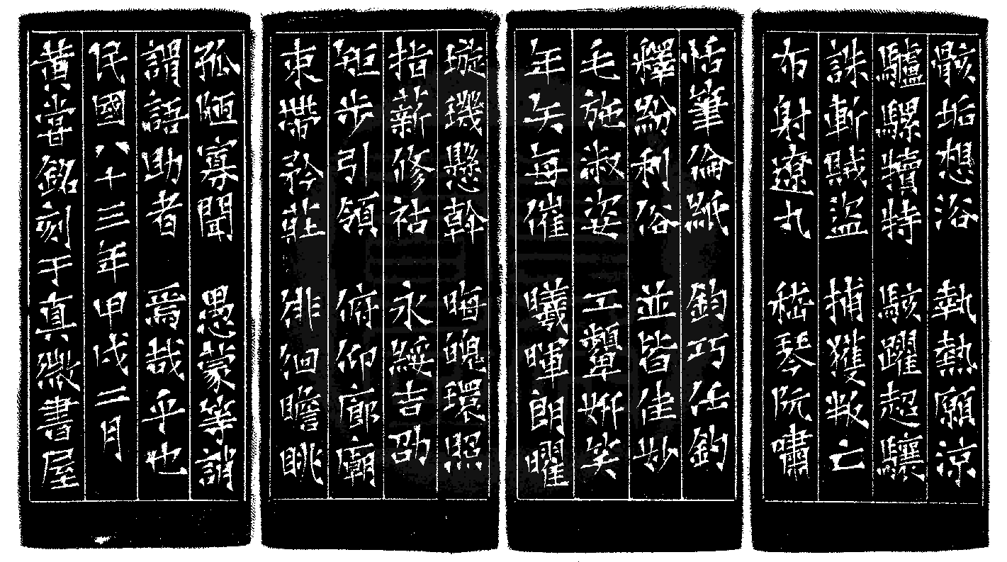 | | 印文:千里猷面 | | 約 橫 2.9 X 豎 2.8 公分 印面圖 印石圖 | | 黃嘗銘.四十二歲/刻〔千里猷面〕正方加框白文印。邊款為【骸垢想浴,執熱願涼,驢騾犢特,駭躍超驤,誅斬賊盜,捕獲叛亡,布射遼丸,嵇琴阮嘯,恬筆倫紙,鈞巧任釣,釋紛利俗,並皆佳妙,毛施淑姿,工顰妍笑,年矢每催,曦暉朗曜,璇璣懸斡,晦魄環照,指薪修祜,永綏吉劭,矩步引領,俯仰廊廟,束帶矜莊,徘徊瞻眺,孤陋寡聞,愚蒙等誚,謂語助者,焉哉乎也。民國八十三年甲戌二月,黃嘗銘刻于真微書屋。】巴林凍。 1995 年刻 |