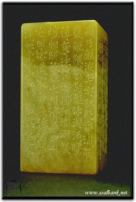 | | 印文:自然神麗而足思願愛樂 | | 約 橫 3.7 X 豎 3.8 公分 印面圖 邊款圖 | | 黃嘗銘.四十歲/刻〔自然神麗而足思願愛樂〕正方白文縱格印。邊款為【且其山川形勢,則盤紆隱深,嶊嵬岑嵒。互嶺巉巖,岝崿嶇崟。丹崖嶮巇,青壁萬尋。若乃重巘增起,偃蹇雲覆,邈隆崇以極壯,崛巍巍而特秀。蒸靈液以播雲,據神淵而吐溜。爾乃顛波奔突,狂赴爭流。觸嚴觝隈,鬱怒彪休。洶涌騰薄,奪沫揚濤。瀄汨澎湃,□蟺相糾,放肆大川,濟乎中州。安回徐邁,寂爾長浮。澹乎洋洋,縈抱山丘。詳觀其區土之所產毓,奧宇之所寶殖。珍怪琅玕,瑤瑾翕□。叢集累積,奐衍於其側。若乃春蘭被其東,沙棠殖其西。涓子宅其陽,玉醴涌其前。玄雲蔭其上,翔鸞集其巔。清露潤其膚,惠風流其間。竦肅肅以靜謐,密微微其清閑。夫所以經營其左右者,固以自然神麗,而足思願愛樂矣。】巴林石。 1993 年刻 |
