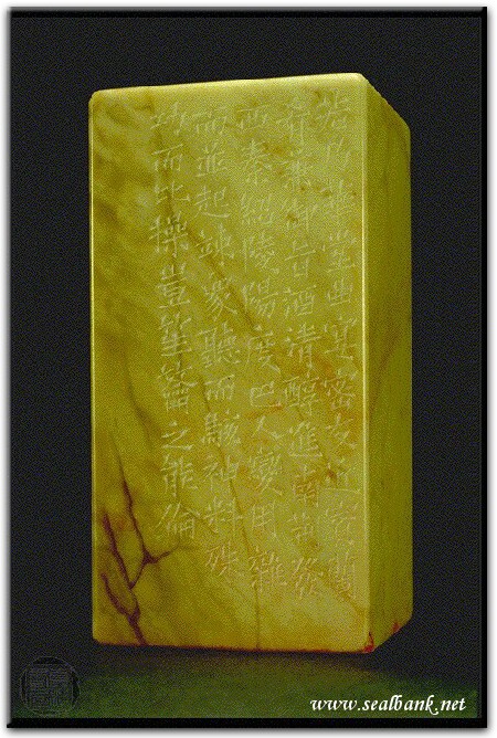 黃嘗銘.四十歲/刻〔料殊功而比操豈笙籥之能倫〕正方朱文印。邊款為【若乃華堂曲宴,密友近賓。蘭肴兼御,旨酒清醇。進南荊,發西秦,紹陵陽,度巴人。變用雜而並起,竦眾聽而駭神。料殊功而比操,豈笙籥之能倫?】巴林石。