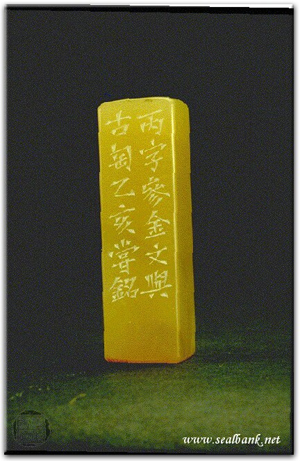 黃嘗銘.四十三歲/刻〔丙〕正方加框白文印。邊款為【丙字參金文與古匋。乙亥,嘗銘。】巴林凍。