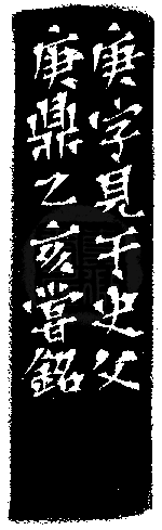 黃嘗銘.四十三歲/刻〔庚〕正方加框白文印。邊款為【庚字見于史父庚鼎。乙亥,嘗銘。】巴林凍。