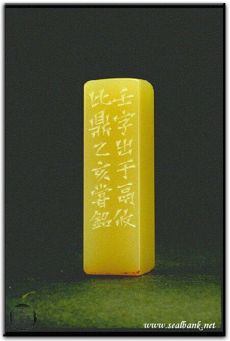 黃嘗銘.四十三歲/刻〔壬〕正方加框白文印。邊款為【壬字出于鬲攸比鼎。乙亥,嘗銘。】巴林凍。