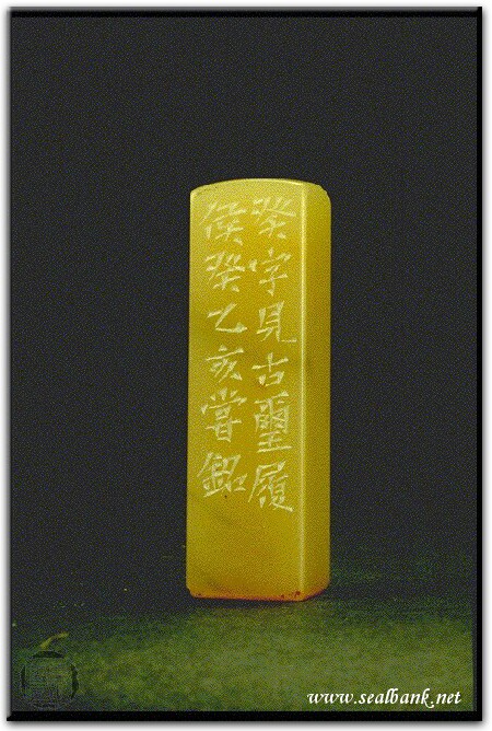 黃嘗銘.四十三歲/刻〔癸〕正方加框白文印。邊款為【癸字見古璽履侯癸。乙亥,嘗銘。】巴林凍。
