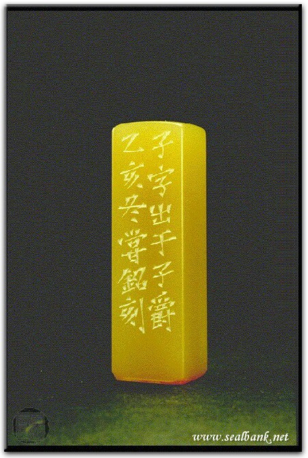 黃嘗銘.四十三歲/刻〔子〕正方加框白文印。邊款為【子字出于子爵。乙亥冬,嘗銘刻。】巴林凍。