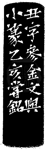 黃嘗銘.四十三歲/刻〔丑〕正方加框白文印。邊款為【丑字參金文與小篆。乙亥,嘗銘。】巴林凍。