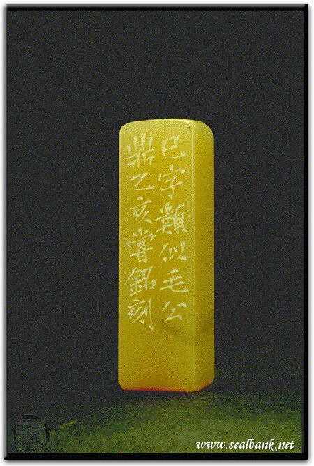 黃嘗銘.四十三歲/刻〔巳〕正方加框白文印。邊款為【巳字類似毛公鼎。乙亥,嘗銘刻。】巴林凍。