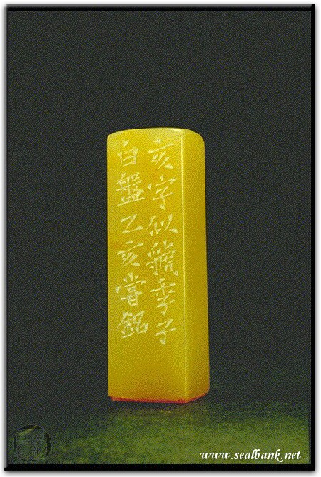 黃嘗銘.四十三歲/刻〔亥〕正方加框白文印。邊款為【亥字似虢季子白盤。乙亥,嘗銘。】巴林凍。