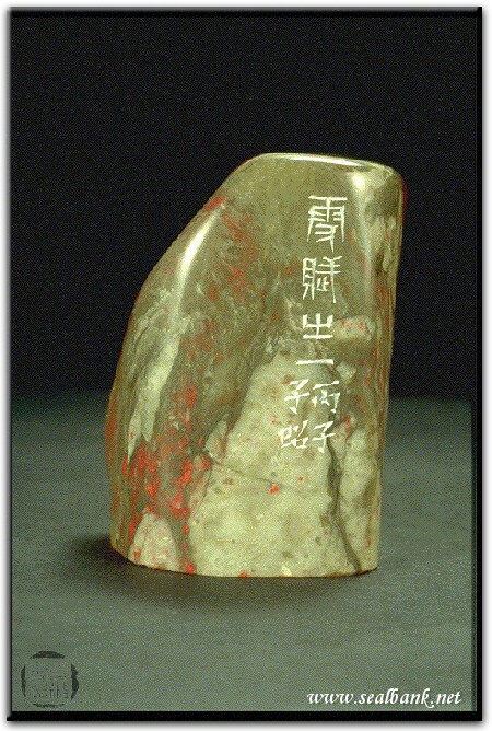 黃嘗銘.四十三歲/刻〔白羽雖白其質輕兮〕自然形朱文印。邊款為【雪賦之一。丙子,子昭。】昌化雞血。