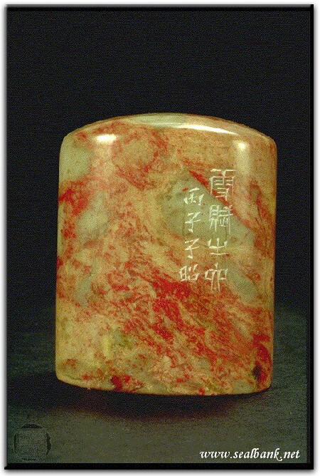 黃嘗銘.四十三歲/刻〔節豈我名潔豈我貞〕自然形朱文印。邊款為【雪賦之六。丙子,子昭。】昌化雞血。