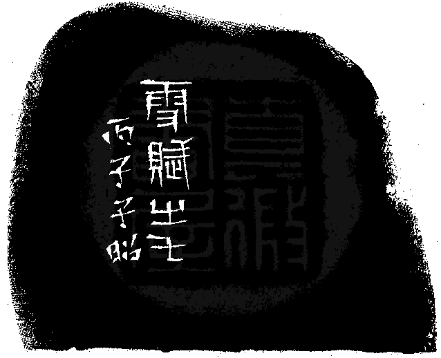 黃嘗銘.四十三歲/刻〔憑雲升降從風飄零〕自然形朱文印。邊款為【雪賦之七。丙子,子昭。】昌化雞血。
