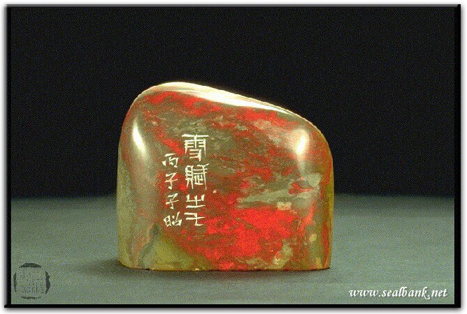 黃嘗銘.四十三歲/刻〔憑雲升降從風飄零〕自然形朱文印。邊款為【雪賦之七。丙子,子昭。】昌化雞血。