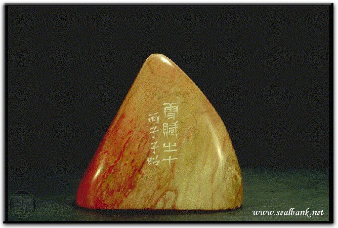 黃嘗銘.四十三歲/刻〔縱心皓然何慮何營〕自然形封泥框朱文印。邊款為【雪賦之十。丙子,子昭。】昌化雞血。