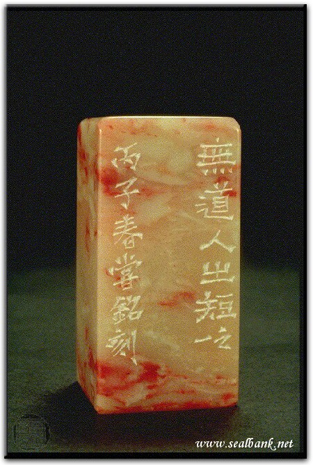 黃嘗銘.四十三歲/刻〔無道人之短〕正方朱文印。邊款為【無道人之短。之一。丙子春,嘗銘刻。】巴林雞血。