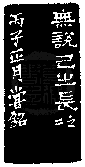 黃嘗銘.四十三歲/刻〔無說己之長〕正方滿白文印。邊款為【無說己之長。之二。丙子正月,嘗銘。】巴林雞血。