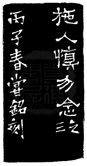 黃嘗銘.四十三歲/刻〔施人慎勿念〕正方朱文借邊印。邊款為【施人慎勿念。之三。丙子春,嘗銘刻。】巴林雞血。